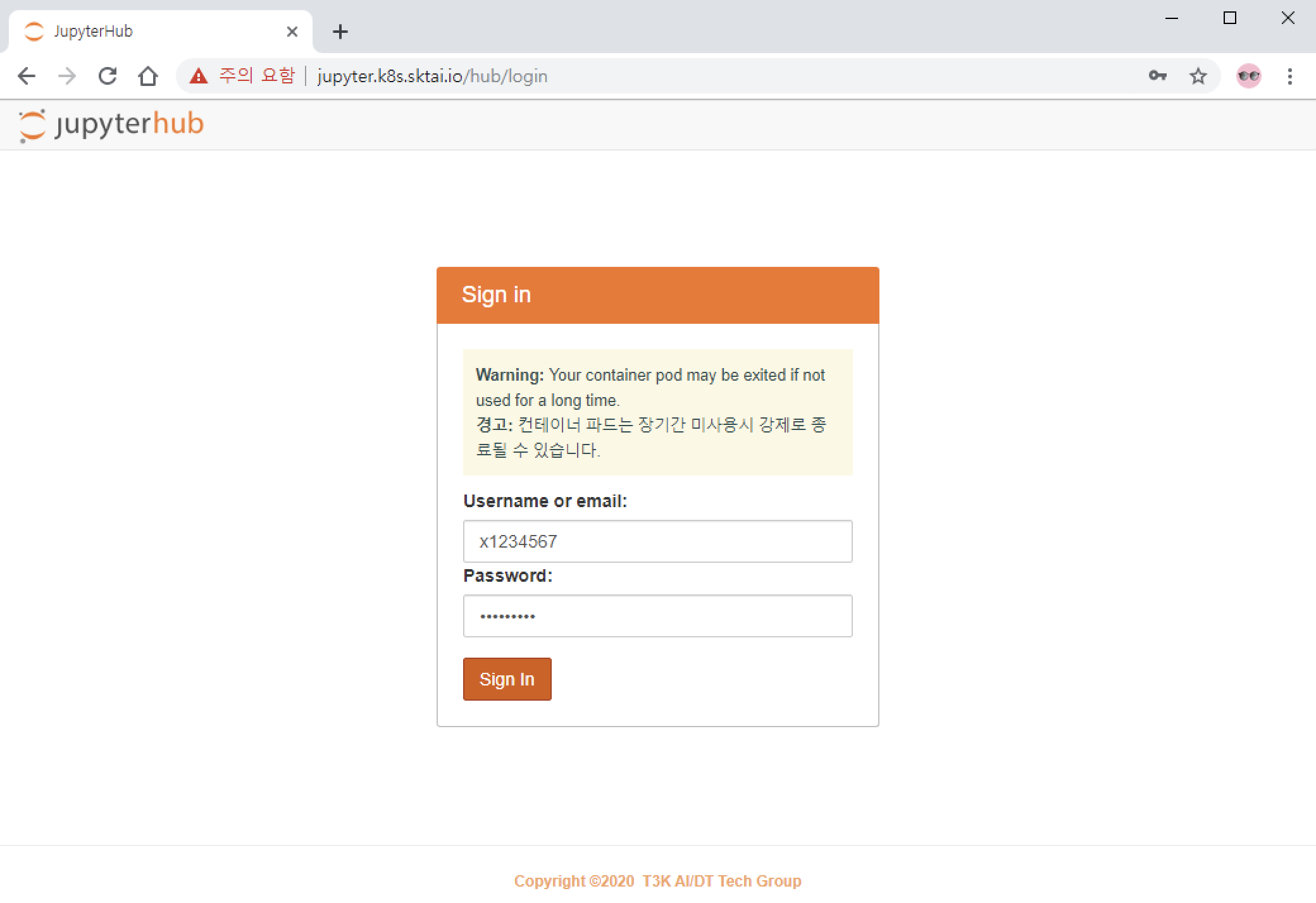 Jupyter에 접속하기 위해서는 사용자 VDI와 SKTML 계정이 필요합니다. VDI 환경에서 웹브라우저를 실행한 후 Jupyter 서비스 URL로 접근합니다.