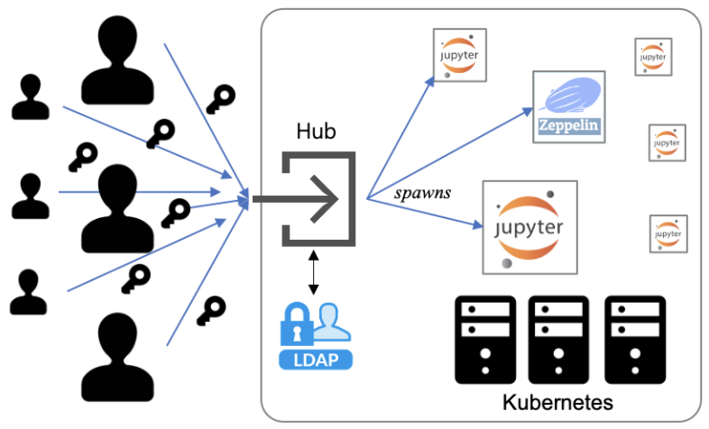 AIDP의 Jupyter는 쿠버네티스 환경에 구축되었습니다. SKTML 계정으로 인증을 받은 사용자는 원하는 기능과 자원을 선택한 후 Jupyter 컨테이너를 할당 받게 됩니다. 사용자 데이터와 분석 결과는 클라우드 저장소에 보관되며 다른 사용자들과 공유할 수 있습니다. 사용자 컨테이너는 자동으로 업데이트 되어 항상 최신으로 유지됩니다.