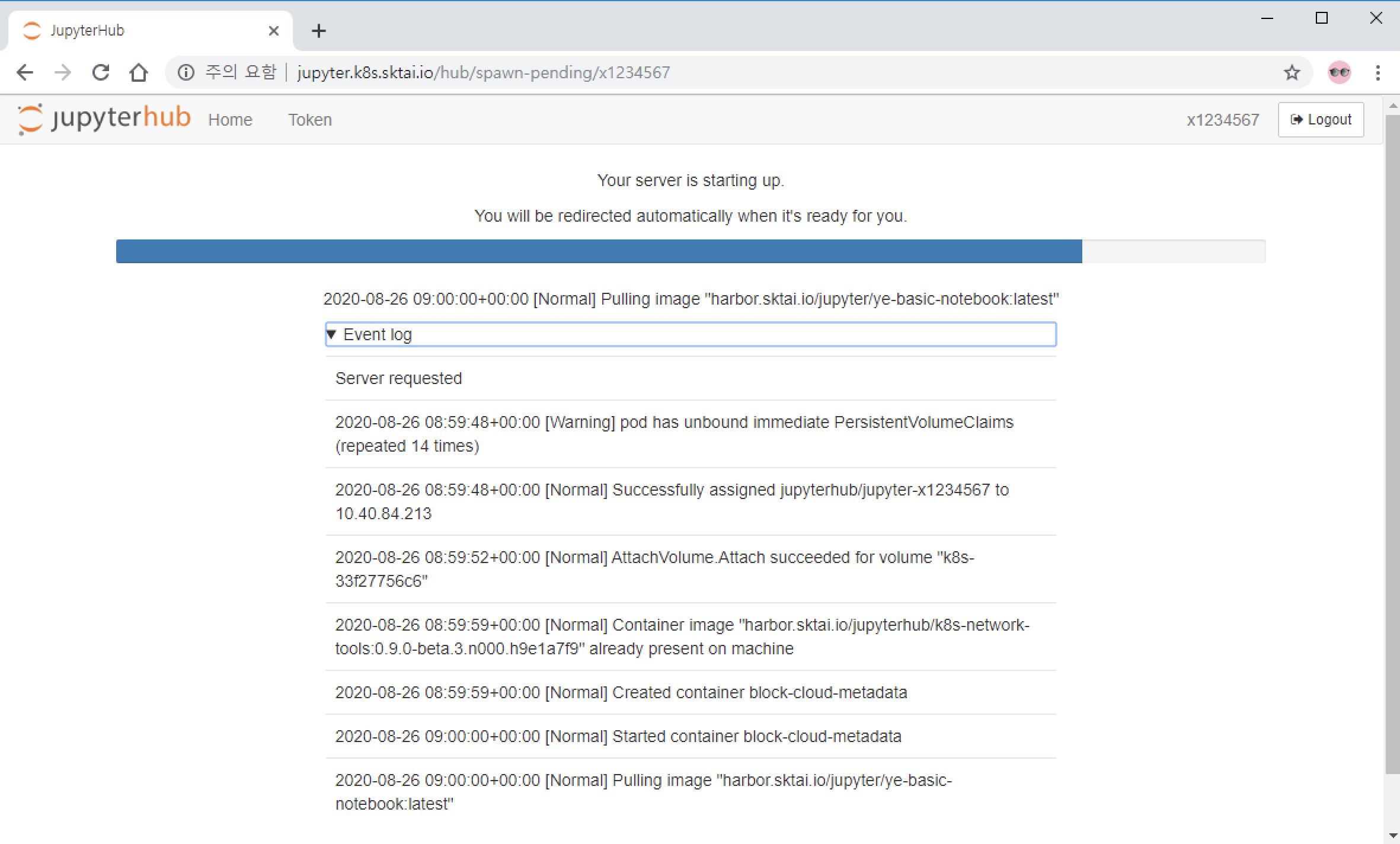 노트북 스택을 선택한 후 "Start" 버튼을 클릭하면 컨테이너 생성이 진행됩니다. 실시간으로 진행 상태가 업데이트 됩니다. 상황에 따라 최대 5~10분 까지 시간이 걸릴 수 있습니다.