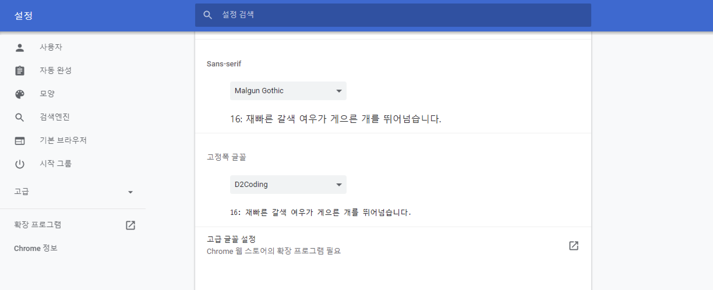 브라우저 폰트를 변경하면 좀 더 가독성이 높은 환경에서 작업을 할 수 있습니다.