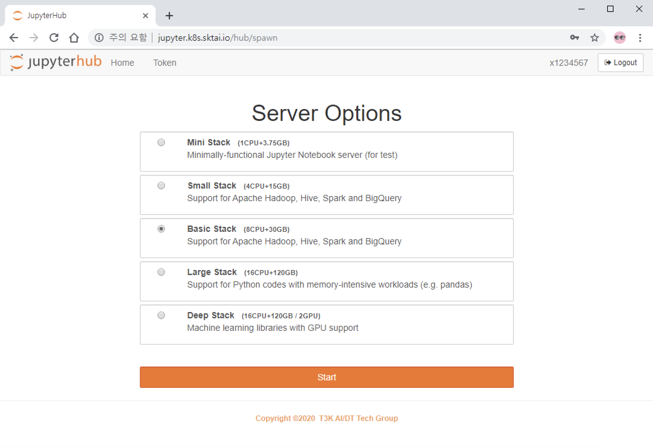 처음으로 접속한 경우, 사용자에게 맞는 노트북 스택을 선택해야 합니다. 총 5개의 노트북 스택이 제공되며, 대부분의 분석 작업은 Basic 스택을 사용하여 할 수 있습니다.